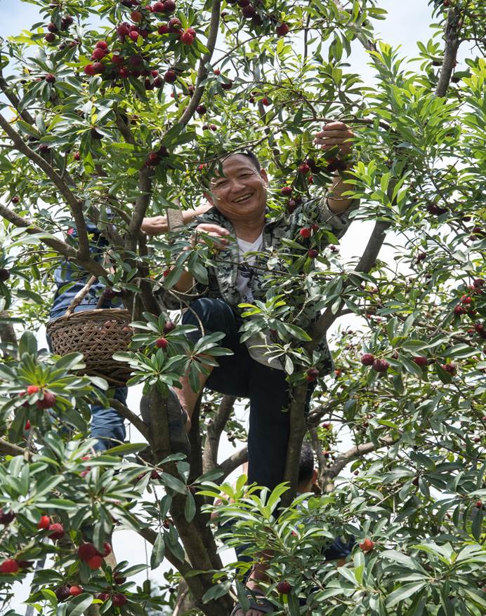 浙江仙居杨梅节启动,仙居杨梅正式进入全面采摘期,果农们怀揣着丰收的喜悦心情,爬上树枝,将一颗颗娇艳欲滴的新鲜杨梅摘下来,轻轻放入果筐。