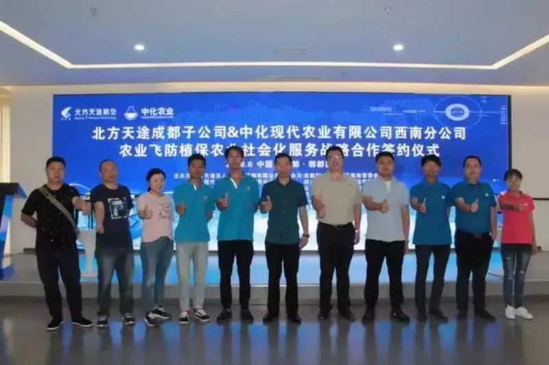 2018年6月1日,北方天途航空成都子公司与中化现代农业西南分公司签署战略合作协议,双方决定在农业植保无人机飞防服务、农业社会化服务、农业大数据、智慧农业、田园综合体建设和国家现代农业示范区等领域开展广泛深入的合作。