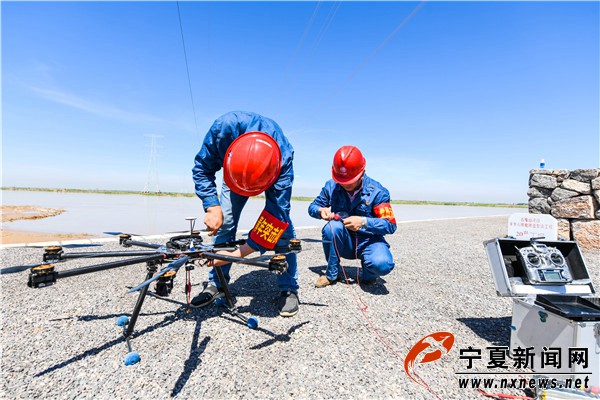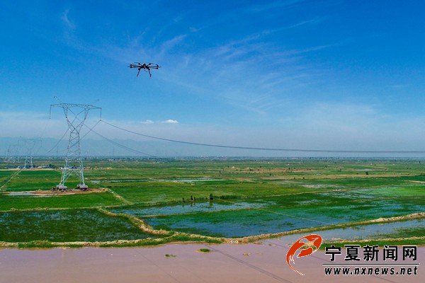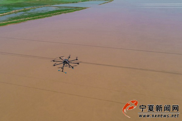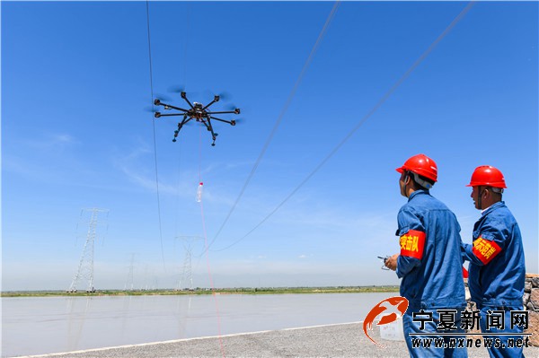 6月10日11时许,在宁夏黄河平罗段,随着一架八轴无人机桨叶的快速旋转,带着一根红色引导线的无人机腾空而起,飞向黄河的对岸开展宁夏沙湖至上海庙750千伏线路跨越黄河放线工程,该工程将于6月底完工。