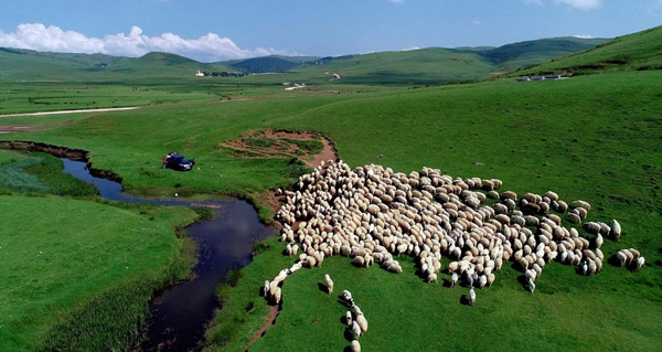 Persembe高地风光,成群羊儿在绿色的草地上吃草。