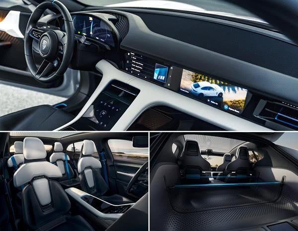而内饰设计方面,保时捷是极简主义者,中控没有任何物理按钮,而电子换挡杆也是布局在方向盘后方。同时,Taycan内饰的5块屏幕组合演绎了何为科技感,包括仪表屏,中控屏,副驾驶屏、HUD抬头显示屏和空调控制屏。其中,中控屏和副驾驶屏是12英寸触控屏。
