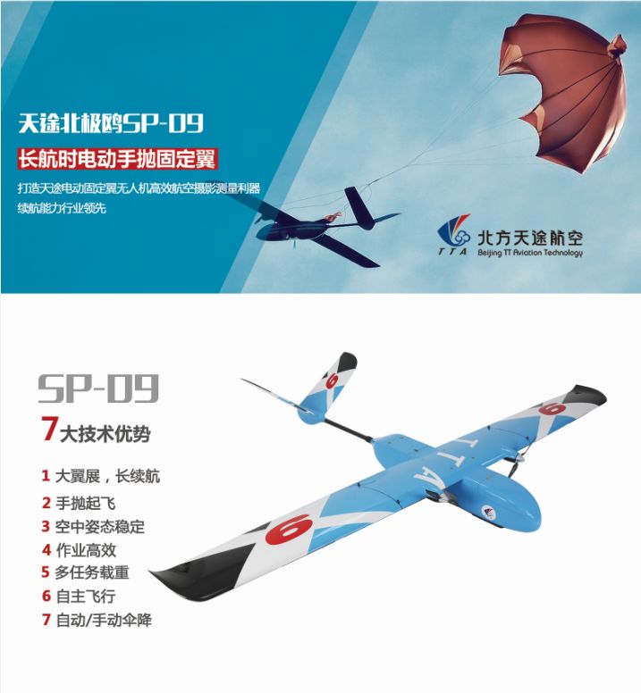 固定翼SP-9,具有长航时,大载荷任务,对特殊复制地形能够精准完成任务需求,能够实现手抛起飞,极大改善固定翼起飞场地要求。