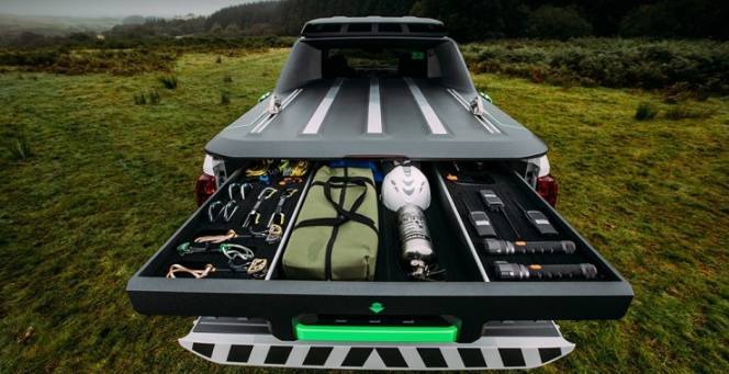 后尾箱可就是完完全全为了救援任务二配备的工具了,首先要说的就是其搭载了来源于聆风车型上的电池组,共7块电池,在救援时能够为切割机、起重机或是其它救援设备供电;再就是电线、对讲机、绳索挂钩、简单的医疗器材;最值得一提的就是还配备了一台大疆Phantom 4无人机,必要时进行空中搜救。
