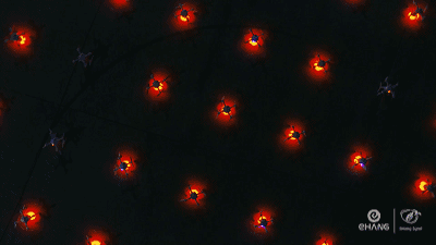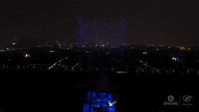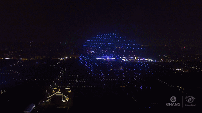 1400架无人机起、降均为暗灯,仅在天幕中表演时为亮灯形式,制造一瞬间同时亮灯的特别效果,更好地配合舞台声光音效脚本的呈现,这种“瞬时炫彩”的新技术,在展示3D立体大明宫殿丹凤门时深受体会。