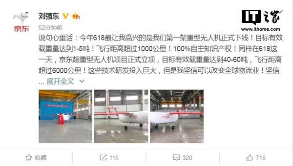 6月19日消息 京东CEO刘强东刚刚发微博表示,京东第一架重型无人机正式下线。