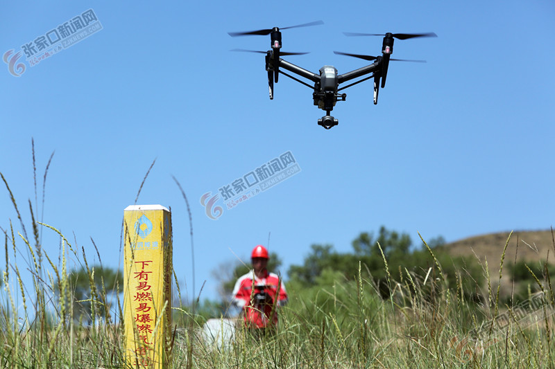 图为工作人员在宣化区深井镇东海洼五虎山山区进行无人机管道巡检。