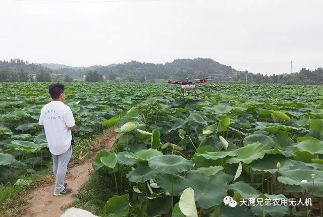6月17日,重庆天鹰兄弟在四川安岳县元坝镇为300亩莲藕防治蚜虫。
