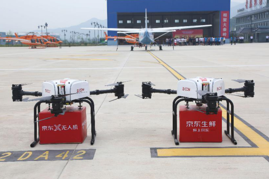 20日上午,载有1吨京东物流货物的塞斯纳208型飞机从陕西蒲城机场起飞,降落至陕西丹凤机场,其中不少为高附加值产品和京东生鲜。飞机停稳后,工作人员迅速将其中急需配送的货品转运至京东末端无人机进行挂载,随后末端无人机编队起飞,快速飞往配送地点,完成了“最后一公里”配送工作。