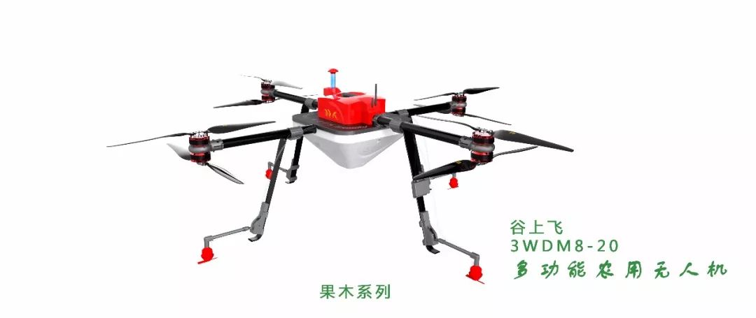 3WDM8-20果木系列多功能无人机,是针对果树、林木等冠层密、宽,株高较高的作物开发,采用共轴双旋翼设计增大下洗气流,增加药剂的穿透性,可根据作业生长情况快速更换不同种类的喷头(如离心喷头及扇形压力喷头等)。采用十字共轴八旋翼设计,减小机体体积增加载药量,方便复杂地形起降及山地运输,同时可使用同一个飞行本体快速更换不同的挂载设备(喷洒功能水剂农药、播撒功能颗粒肥及种子、喷粉功能粉剂),实现不同的功能。