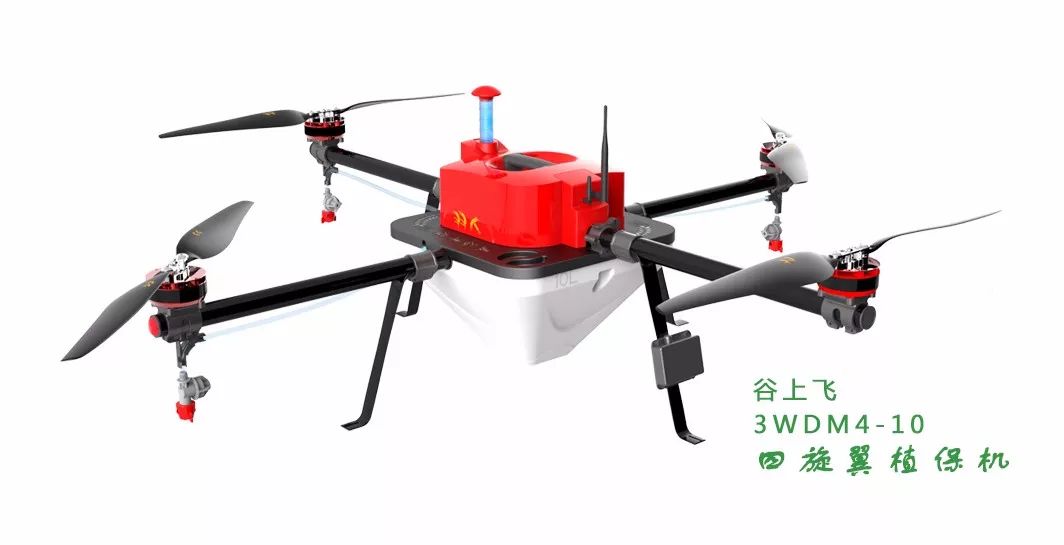 谷上飞3WDM4-10四旋翼植保机,其作业喷头置于旋翼的正下方,飞行中能产生强大下洗气流,可将药液喷洒到植物的根茎部,具有效果好、效率高、成本低、体积小、航时长等特点。