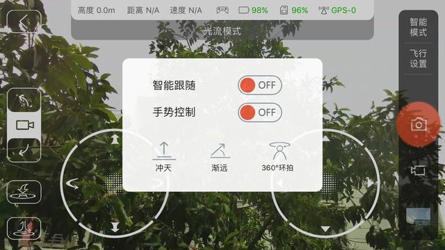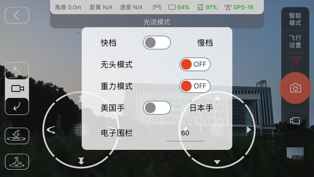 经过校准以后我们可以尝试飞行了,在这个专属的APP里面,有多种智能模式,一键起飞、降落,一键大片、无头模式等,还有档位以及美国手/日本手等操作方式的切换,总体而言这个APP控制还是很简单的,相信是第一次玩也能快速掌握。