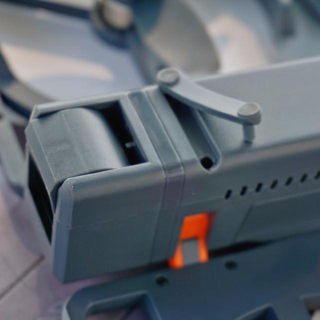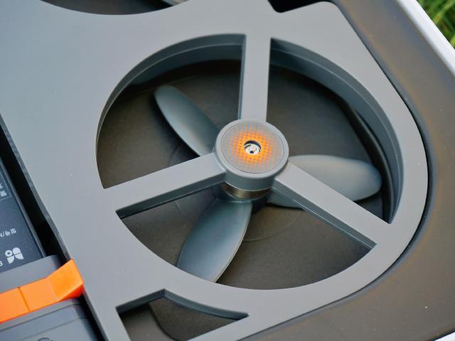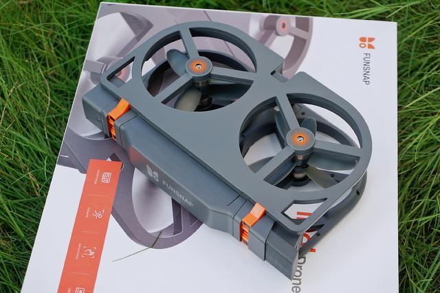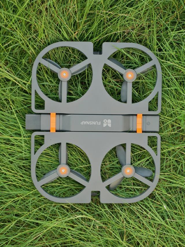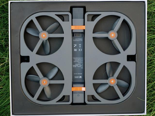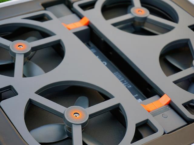 开箱后看到实物的第一感觉便是小巧精致,灰黑搭配橘红的配色给人满满的科技感,简单无人机骨架设计抛弃了所有增加重量的部分,同时,iDol智能飞行器尺寸真的不大,它采用四轴可折叠设计,可折叠收纳,官方数据称折叠后尺寸为226×144×48(mm),经小编实测也相差无几,同时装上电池后的整机重量仅360克左右,重量轻并且方便收纳,即使携带到户外,也不会造成困难和不便。