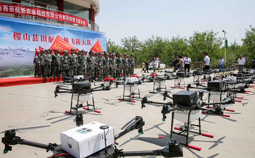 近日,运城市稷山县田航农林飞防大队成立仪式在该县万亩枣园观景台前举行。当日,30架植保无人机亮相观景台现场,千余名农民朋友现场观看了无人机的喷药过程。无人机植保技术,具有安全高效、精准快速、操作便捷、成本低廉等特点,是新型农业现代化的高科技手段,对于有效防治枣树病虫害发生,提高防治效率和防治质量,进一步提高板枣品质,促进枣农增收具有重要意义。