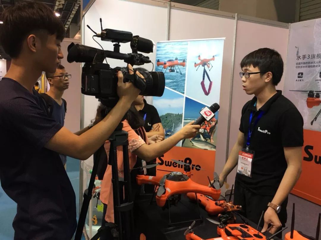 斯威普工作人员现场接受广州电视台采访,为媒体讲解防水无人机的优势和应用领域。