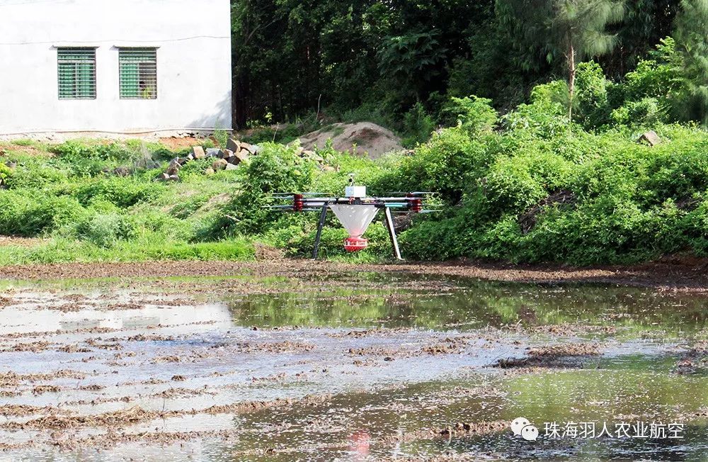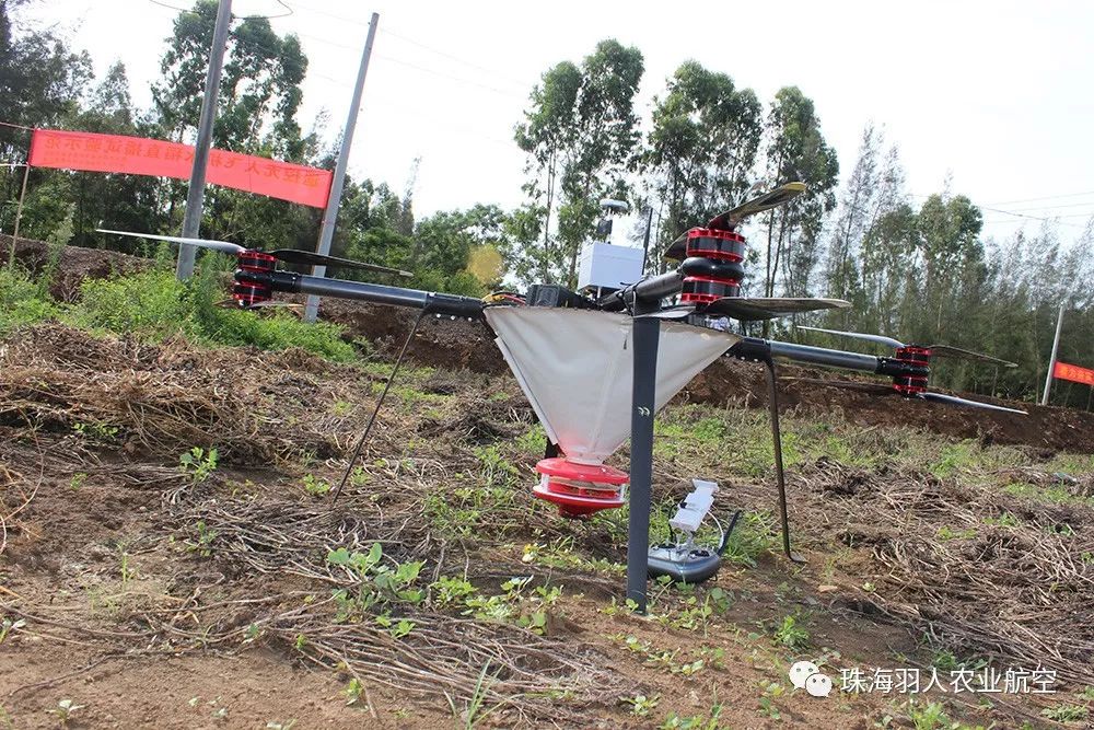 现场演示中,珠海羽人携公司主推产品同轴反桨20kg水稻种子直播无人机这台“看家宝贝”,演示无人机水稻种子直播的“绝技”。 全程一键操作模式深深赢得了现场人员、与会媒体关注。定速、定高和定量播撒,不仅保证了水稻种子得到均匀的播撒,而且高效作业节约了种子,节省工作量。技术人员还向现场参观人员详细讲解了无人机水稻种子直播的基本情况、技术特点以及优势。