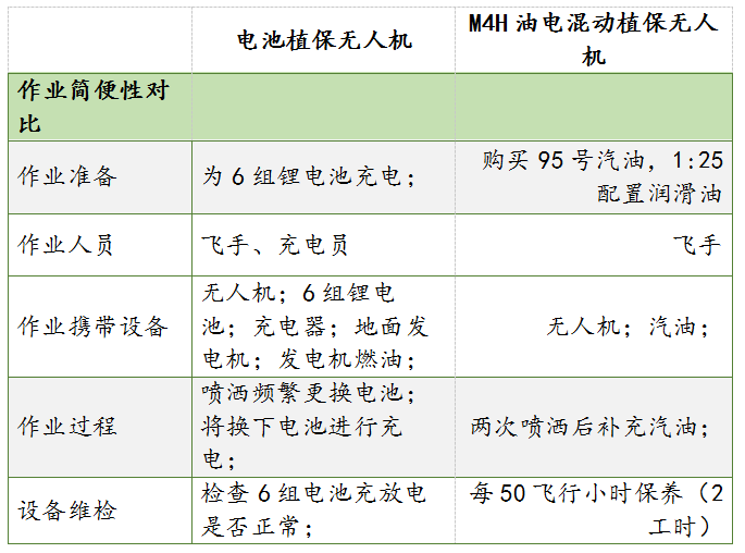M4H兼具了电动无人机和油动无人机的双重优点:操控灵活和长续航。无需携带电池和地面充电设备,实现单人肩背作业。对比传统以电池为能量源的植保无人机在作业便携度和成本方面优势突出: