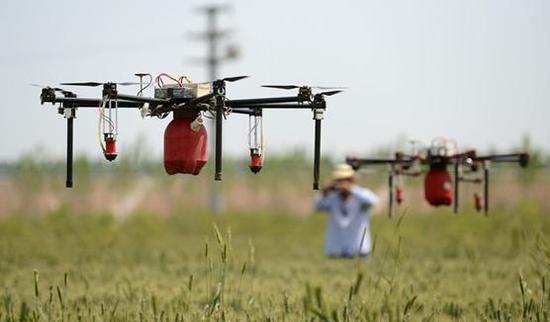 图为田间地头飞行的植保无人机,喷洒农药和投射武器其实在技术上只有一墙之隔。