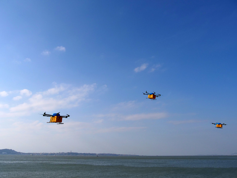 搭载6箱百香果的无人机群组从福建省莆田市秀屿区海边,飞向湄洲岛。(资料片)新华社发