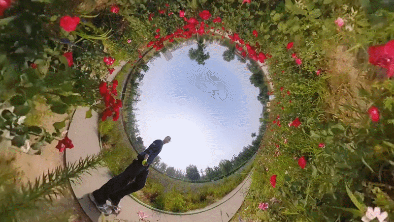 Insta360 ONE的玩法也非常多,就连简单的利用自拍杆将Insta360 ONE贴着绿草红花走,拍出来都别有一番乐趣。