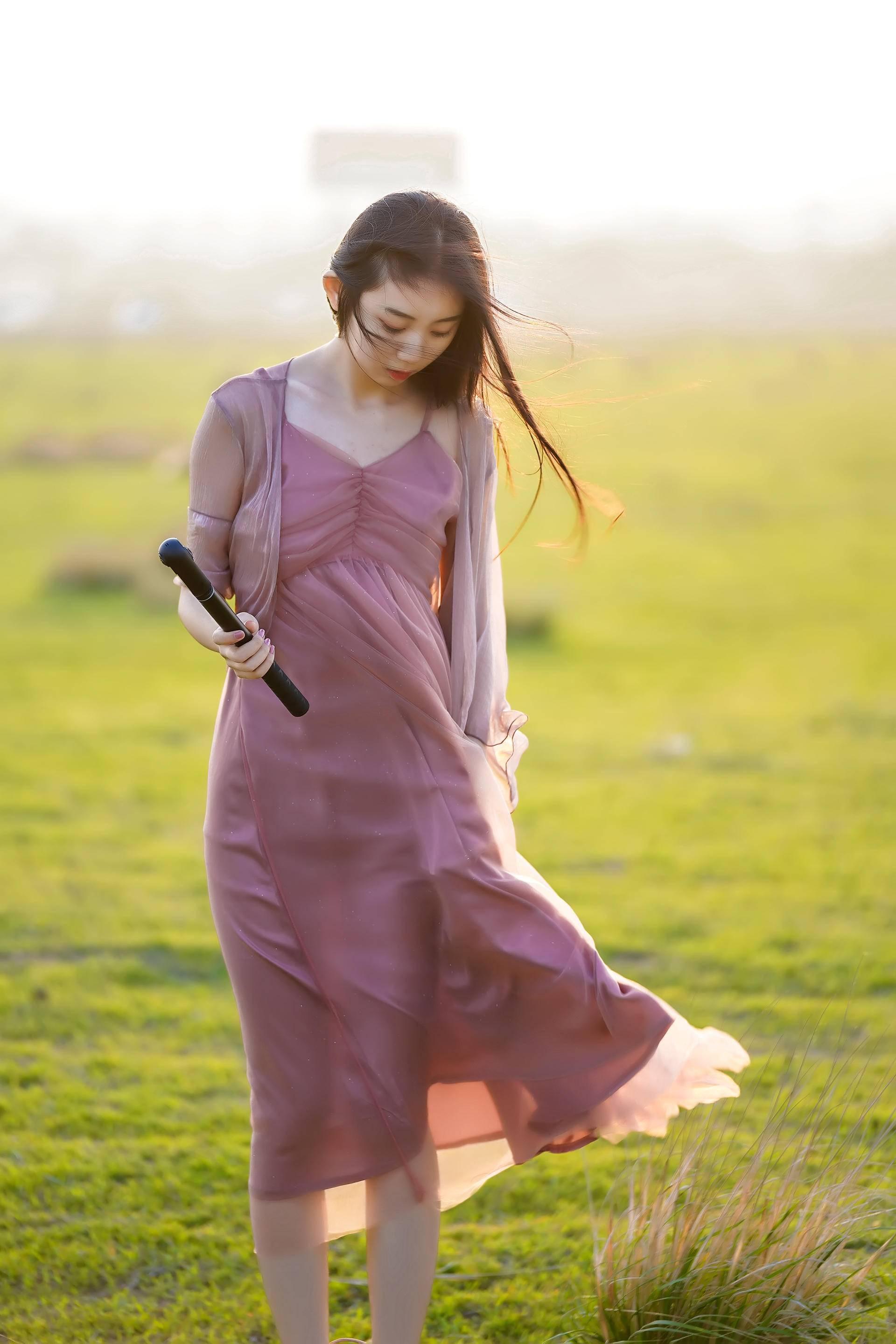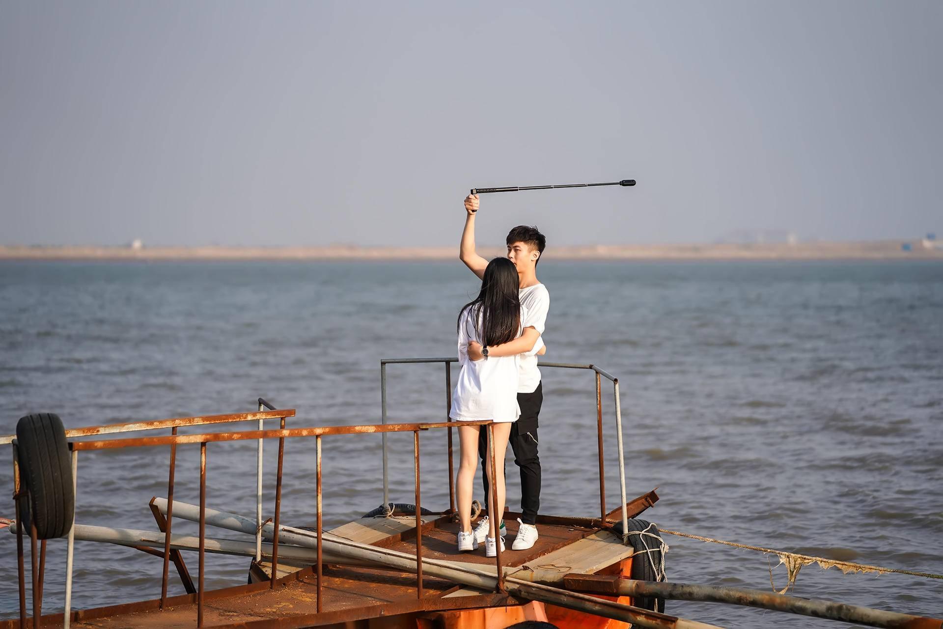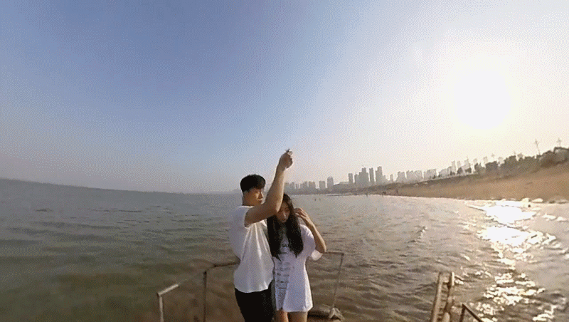 在体验子弹时间套装时,恰逢海边有一对儿情侣正在散步,邀请她们体验了一下。