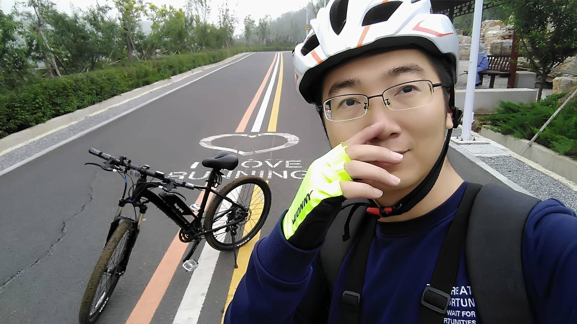 不过比较尴尬的是这个公园只允许步行/跑步,并不允许公路车、山地车、电动车等骑行工具,好在我知道怎么从后山上进去,所以我是直接从山顶上“进”的公园,哈哈。用骑行套装里的胸带安装好Insta360 ONE,记录下了上述这一刻(被保安发现了,正在驱逐驶离公园,可是凭什么保安就可以骑电动车啊,不服也不行,哈哈,反正我拍到想要的画面了)。