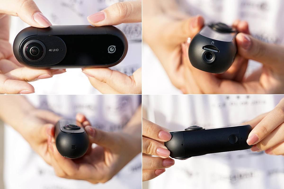 机身体积仅有96mm*35mm*36mm,每一侧都有相应的功能点,可以说设计者也是煞费苦心将产品的体积压缩到了极致。除了正反两面的摄像头之外,在机身的上下侧分别有开关键和充电、连接、重置接口,机身的左右侧则为麦克风和TF卡槽、自拍杆连接口。