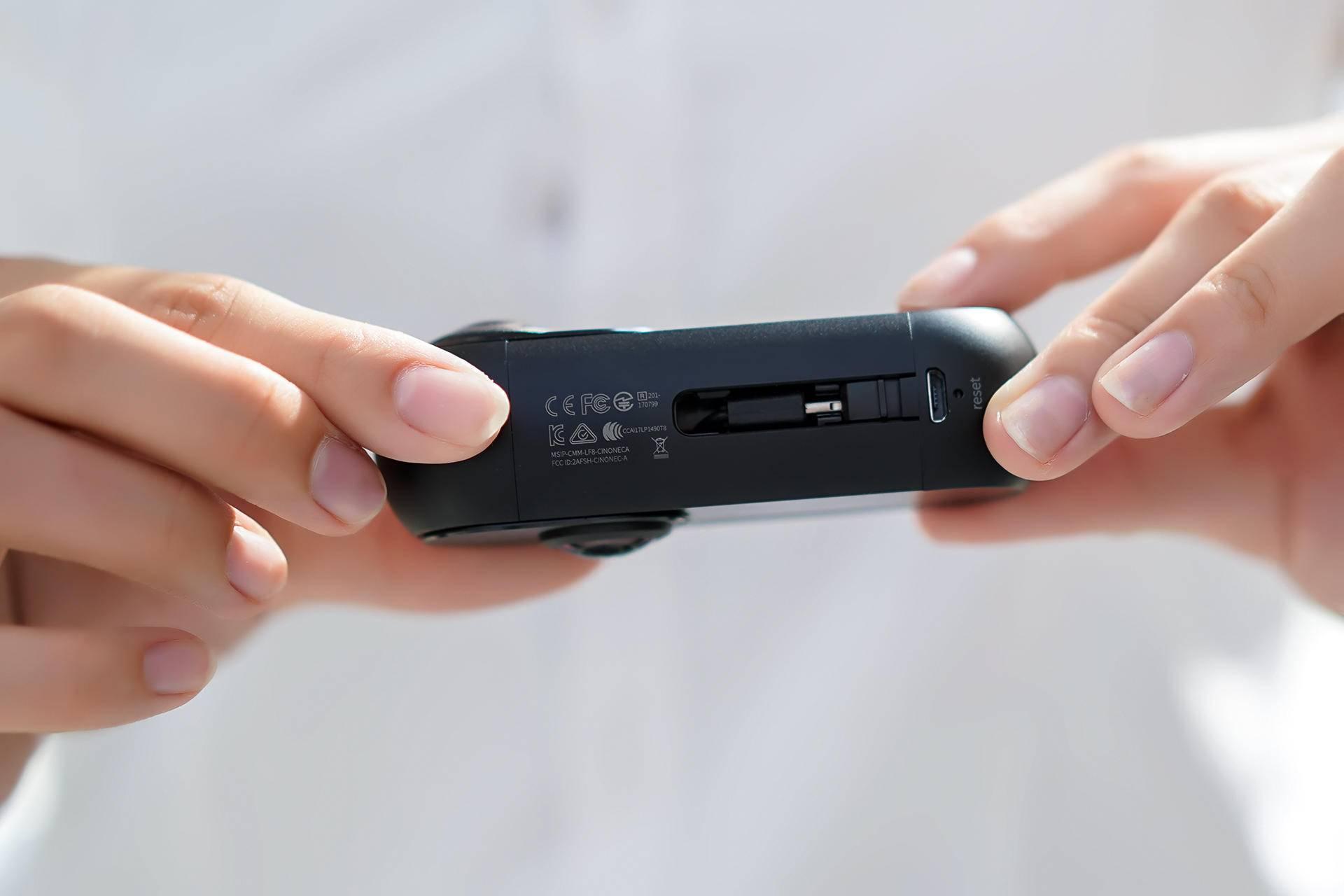 Insta360 ONE配备了820mAh的内置电池,实测续航在1个小时以上,约为70分钟,也远远超出了普通运动相机的续航水平。充电口为传统Mini USB,但需要注意的是,它与手机连接的接口为Lightning接口,也就意味着在没有安卓配件的情况下只能使用苹果手机进行连接。