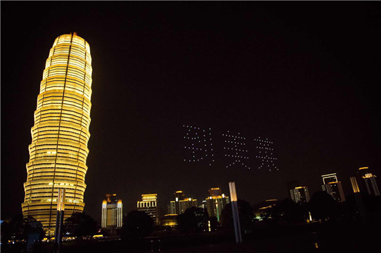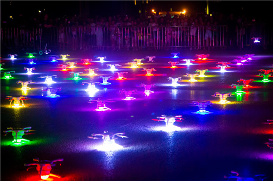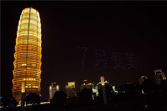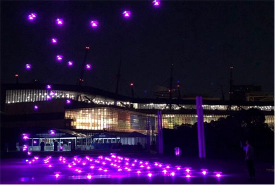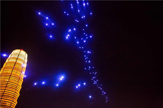 无人机群以每20架左右为一波,分8批逐渐升空,在200米左右高空,全部无人机形成巨大流星带,从大玉米东侧向西缓缓移动,最终悬停在如意湖上空,和大玉米楼交相辉映,现场尖叫声不断。