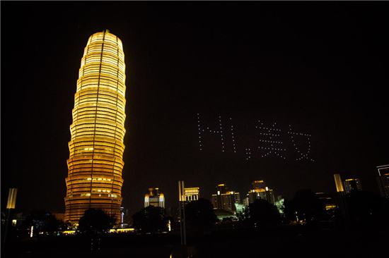 无人机编队到达空中,慢慢摆出一行字:“HI!美女”,听上去像是在给全城美女打招呼。
