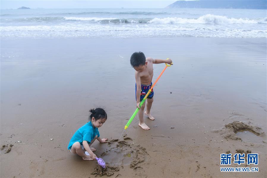 7月1日,孩子们在朱家尖南沙景区的沙滩上玩耍。新华社记者徐昱摄