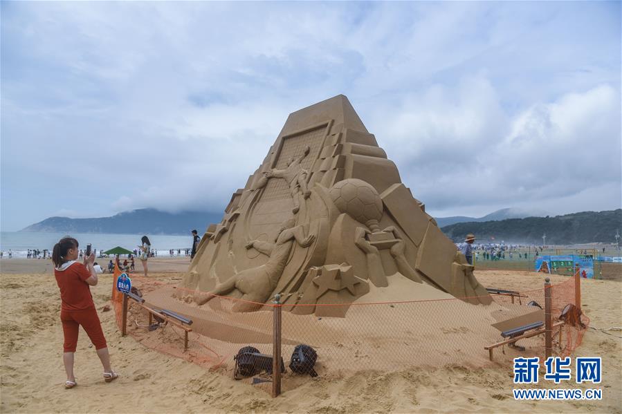 7月1日,游客在朱家尖南沙景区观赏世界杯主题沙雕。新华社记者徐昱摄
