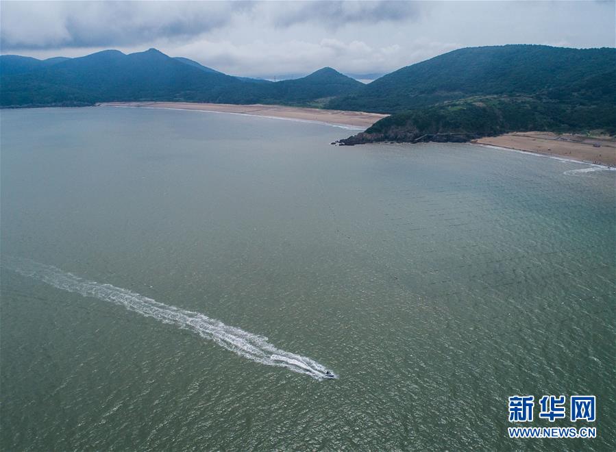 7月1日,摩托艇在朱家尖南沙景区海面上行驶(无人机航拍)。新华社记者徐昱摄