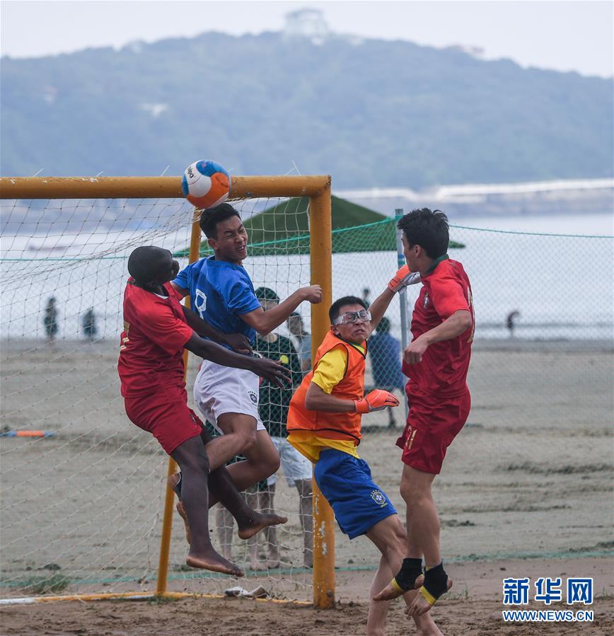 6月30日,足球爱好者在朱家尖南沙景区参加趣味沙滩足球赛。 新华社记者徐昱摄