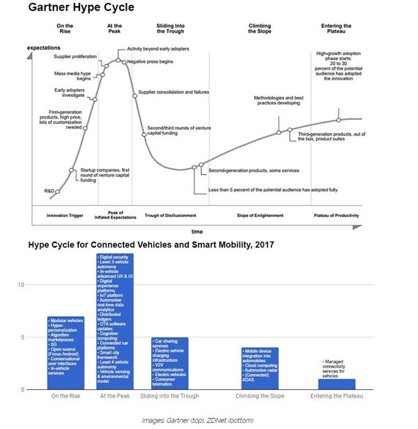 为了概述这个主题领域的大部分内容,值得研究一下Gartner的技术成熟度曲线,以及2017年与互联汽车和智能移动相关的技术现状: