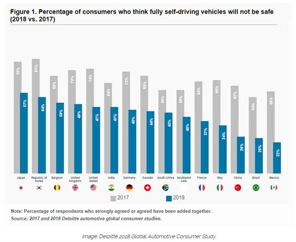 这些调查结果得到了德勤2018年全球汽车消费者研究的回应,该研究发现,认为完全自动驾驶汽车不安全的受访者比例从57%(日本)到22%(墨西哥)不等。在去年的调查中,这一数字要高得多,介于81%(韩国)和54%(巴西)之间: