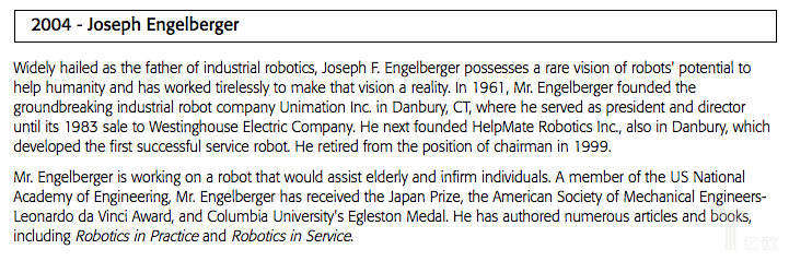 2004年,Joseph Engelberger获奖。Joseph Engelberger被誉为工业机器人之父,1957年他与乔治·德沃尔创立了万能自动公司Unimation,也是世界第一家机器人公司;1959年他研制出了世界上第一台工业机器人尤尼梅特。美国机器人工业协会会长Jeff Burnstein曾赞扬Joseph Engelberger:“他对科技的进步作出了很重要的贡献,因为他,机器人成为了全球性产业。他走在了时代的前面,他几十年前就能从昆虫和鸟类想到了机器人。”