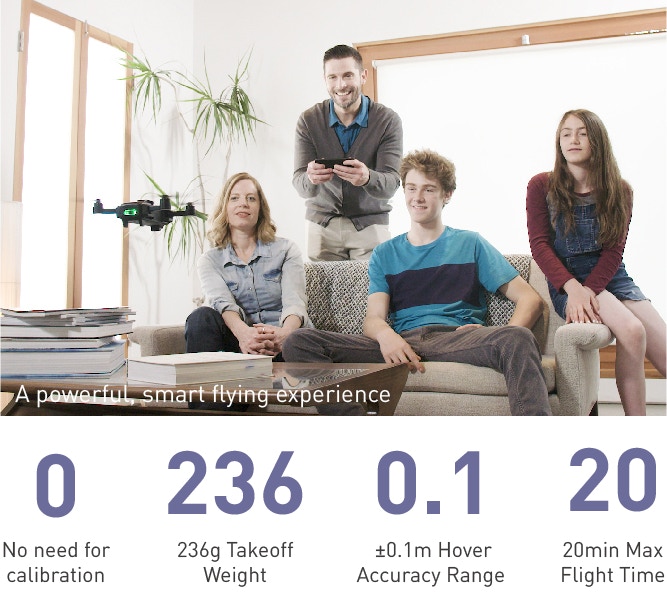 Mark 重 236 克,轴距是 210 毫米,折叠后尺寸为 148 X 73 X 48 毫米,与一部 iPhone X 相若。它的最大水平飞行速度为每秒 3 米,最大续航力 20 分钟。航拍表现方面,它具备 1/3.06” 13MP CMOS 传感,可拍摄最大 3840 X 2160 照片、4K 30FPS 影片,影像稳定系统为电子防抖。此外,它也具备一般航拍机也有的一键起飞、目标追踪、手势控制功能,更可声控起飞,以及不需校准指南针(Compass Calibration)。