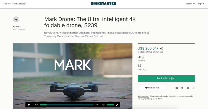 MARK 航拍机在 Kickstarter 的众筹将于下月 13 日完结,目标集资金额只为 31,857 美元。其包括 1 机 1 电池 1 组旋翼的早鸟单机定价 239 美元,标准价则为 259 美元(港币 2,029 元)。另多一块电池的早鸟套装定价 259 美元,标准价为 279 美元,加配遥控器则需 319 美元。截至今日下午 3 时,已有逾 900 人支持项目,集资超过 25 万美元,成绩相当不错。