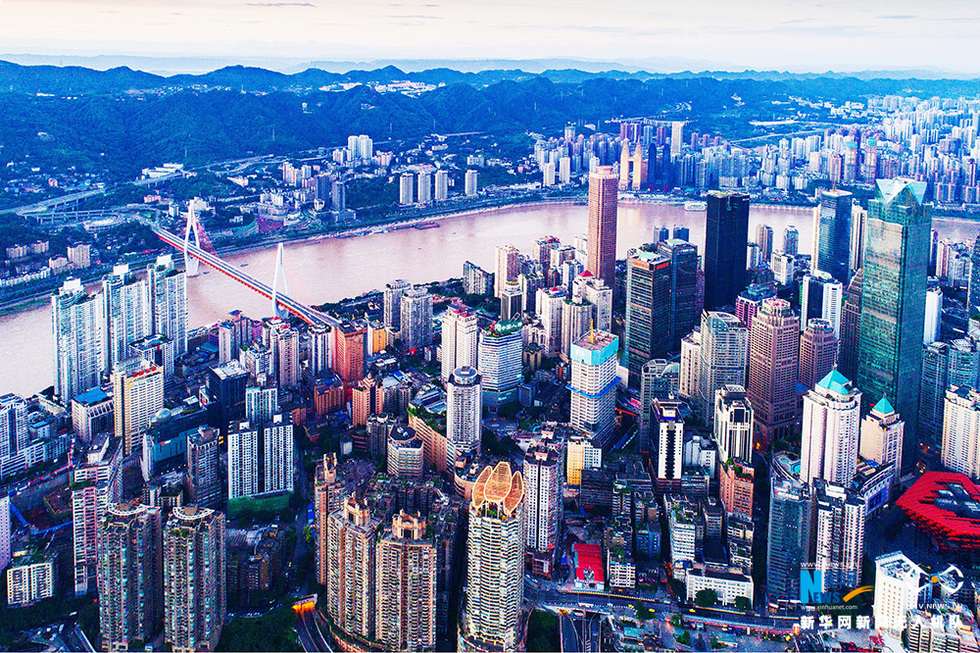 图为清晨五点三十一分,无人机航拍重庆朝天门,朝霞逐渐取代华灯,城市夜色渐渐隐去。新华网发(龚祖章 摄)