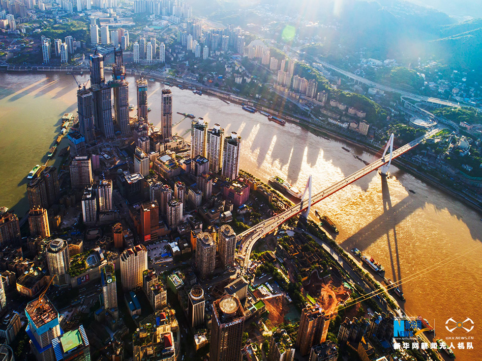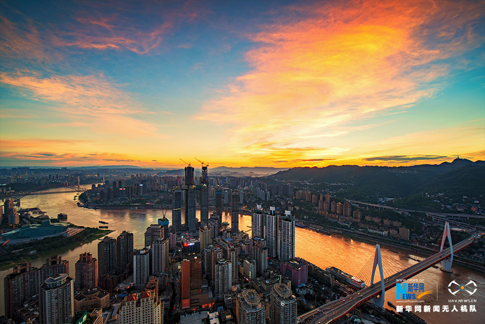 图为清晨五点四十七分,无人机航拍重庆朝天门,此时已朝霞满天,江水被镀上一层金光。新华网发(龚祖章 摄)
