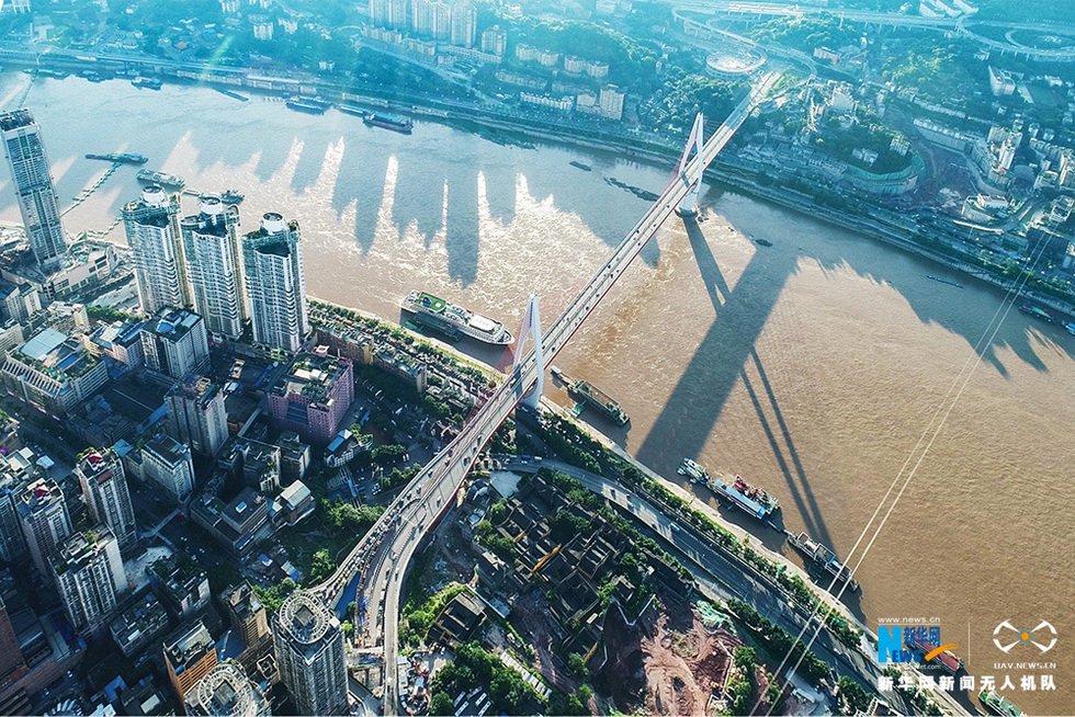 图为下午三点二十八分,无人机航拍重庆东水门大桥,城市建筑倒映在江水中。新华网发(龚祖章 摄)