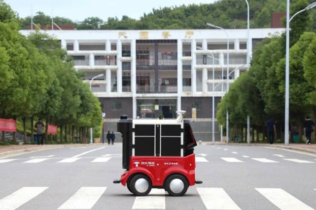 2018年6月,在贵阳市贵州交通职业技术学院内,京东一台无人配送机器人正在运送包裹