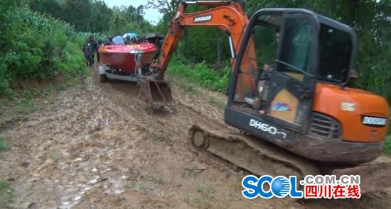 11日清晨7时许,救援人员再次集结到达现场,观察发现河面水位已下降约2米,河面水流较昨晚有所回缓,考虑到持续降雨,当地政府决定由消防部门实施强行救援。上午9时30分许,在挖掘机的牵引下,消防冲锋舟安全运送到事发水域,并在当地镇村干部和群众的帮助下将冲锋舟下到河中。消防人员根据河面水流变化采用V字型行进成功到达河对面岛边,于9时51分成功将2名被困群众接到船上营救回安全区域。
