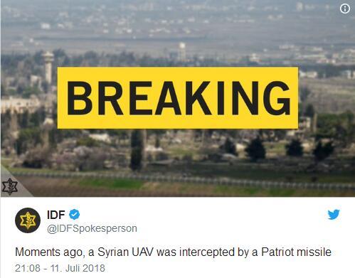以军方表示,这架无人机进入了以色列领空,以军发射一枚爱国者导弹将其击落。