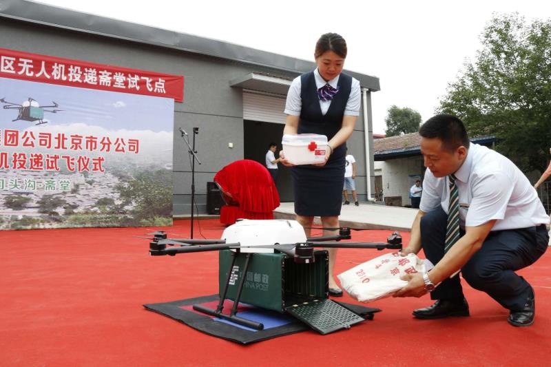 7月13日,中国邮政集团公司北京市邮政分公司在门头沟斋堂邮政支局举办无人机投递试飞仪式。
