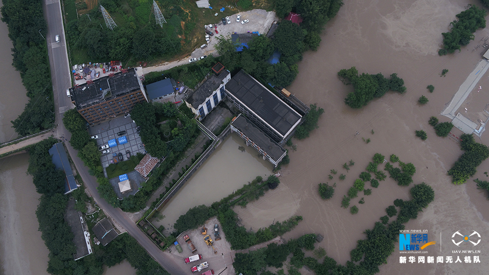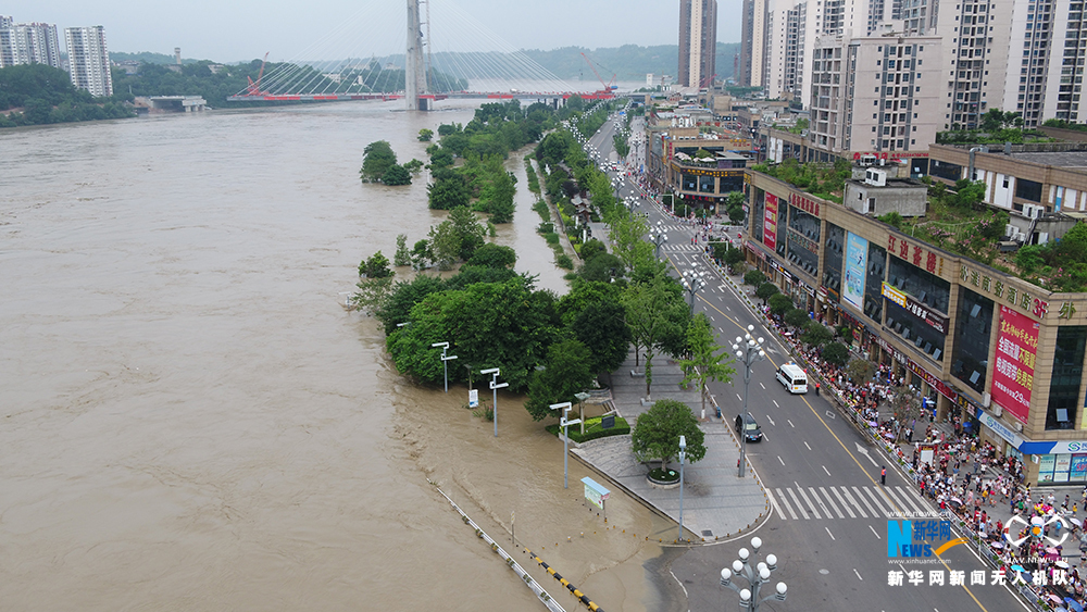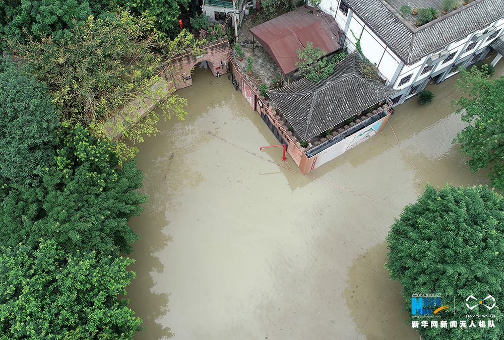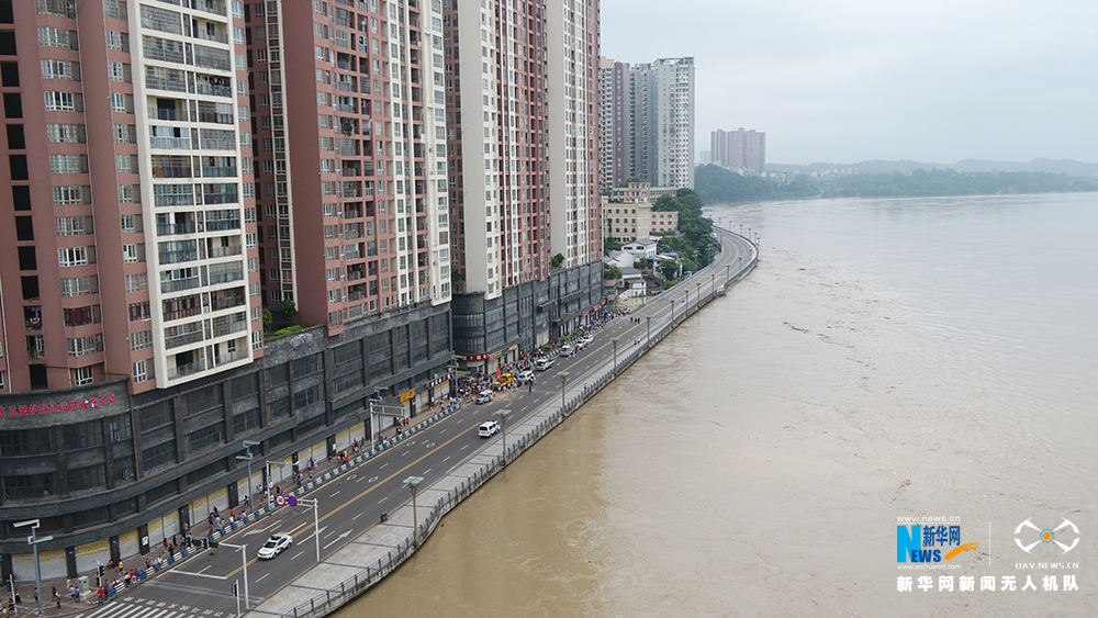 7月12日,受上游强降雨及来水影响,重庆市长江、嘉陵江、涪江均出现明显涨水过程,多地出现超警戒水位洪水。图为重庆市潼南区滨江路,洪水逼近居民楼。新华网 郑杰 摄