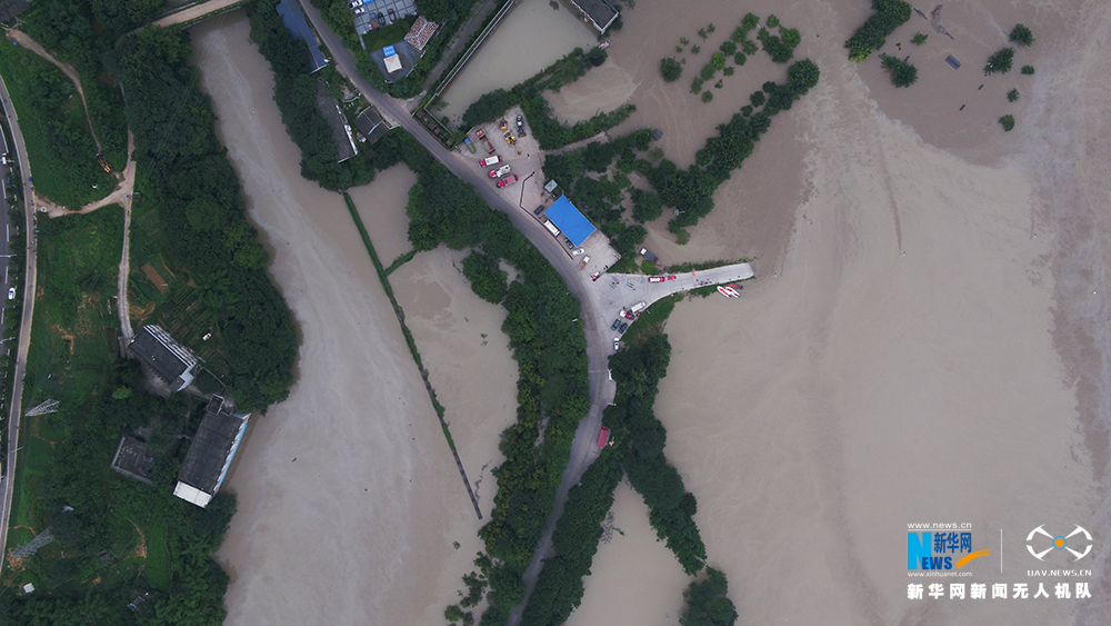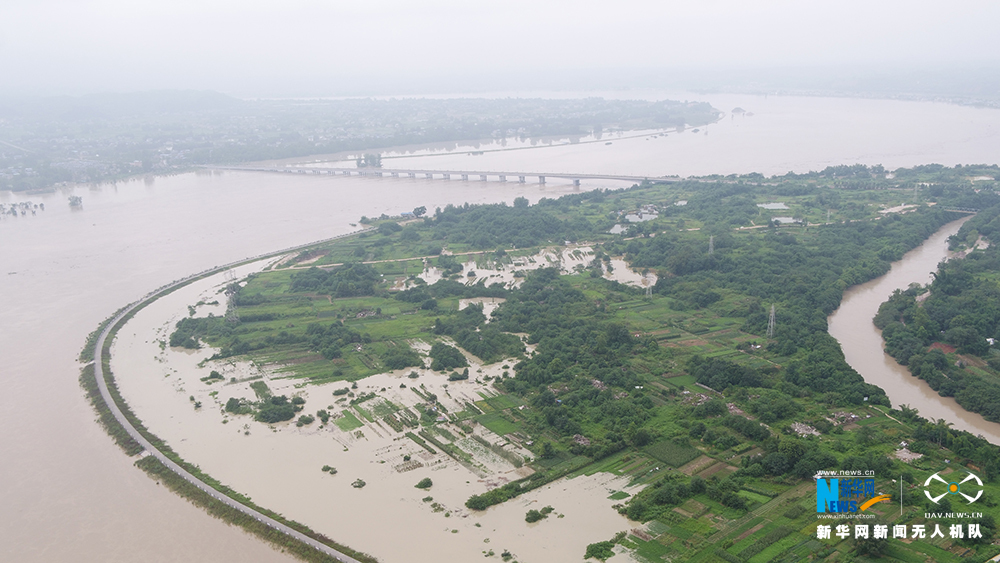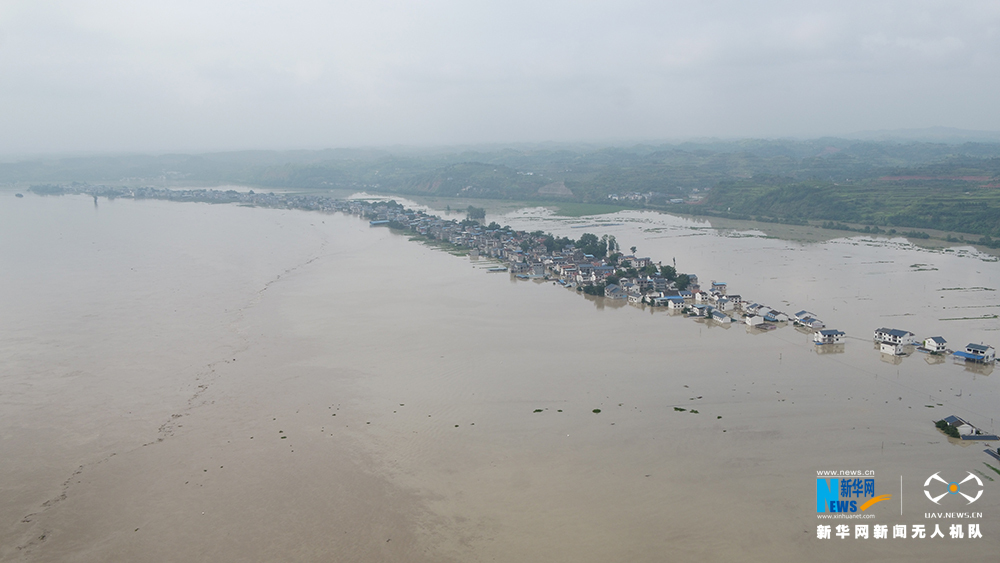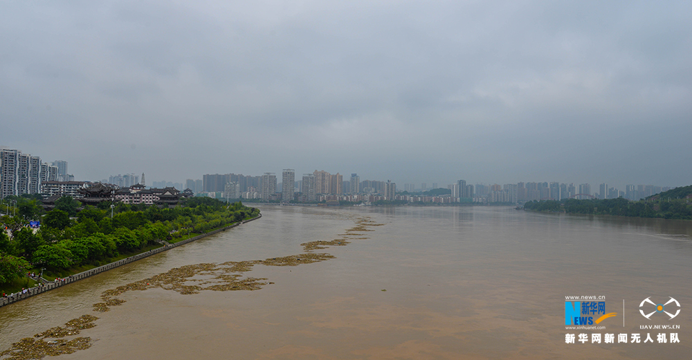 7月12日,受上游强降雨及来水影响,重庆市长江、嘉陵江、涪江均出现明显涨水过程,多地出现超警戒水位洪水。图为重庆市合川区鸭嘴附近江面情况。新华网发(余启华 摄)