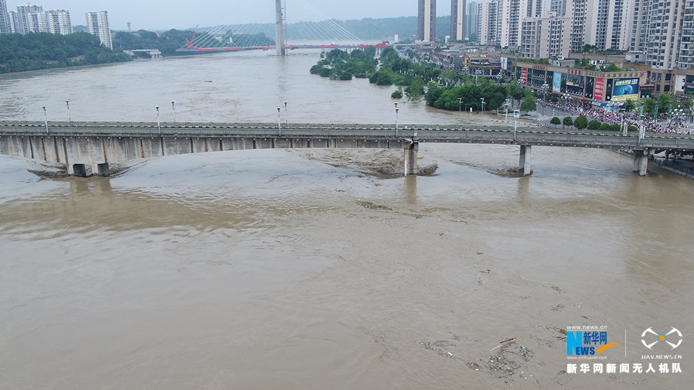 7月12日,受上游强降雨及来水影响,重庆市长江、嘉陵江、涪江均出现明显涨水过程,多地出现超警戒水位洪水。图为重庆市潼南区滨江路,洪水逼近桥面。新华网 郑杰 摄