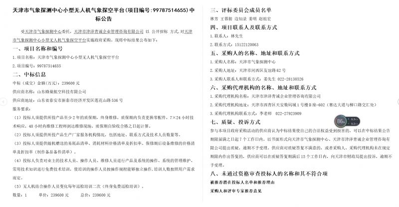 2018年6月28日,蜂巢航宇中标天津气象探测中心小型无人机气象探空平台项目。该项目为天津市气象探测中心公开招标项目。