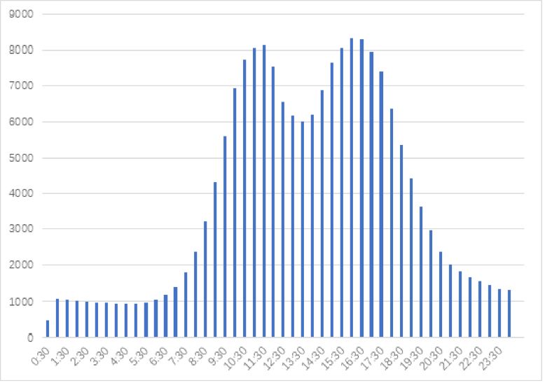 此部分对无人机运行时间进行了统计,以30分钟为时间间隔,具体见图5,图中时间为北京时间。目前我国的无人机运行主要是昼间运行。